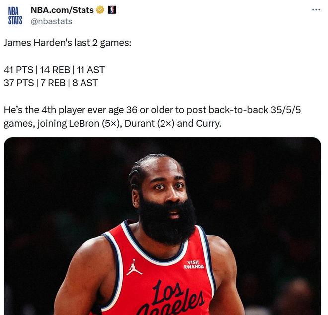 全场哈登空砍全场最高的37分,外加7篮板8助攻1抢断成功打破纪录,成为NBA历史上第4位在36岁之后,还能连续两场至少交出35分5篮板5助攻的球员,前三人分别是詹姆斯、杜兰特和库里。