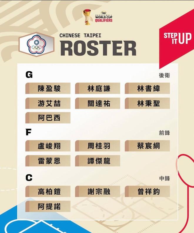 中国台北男篮世预赛名单:CBA三将领衔,林书纬在列
